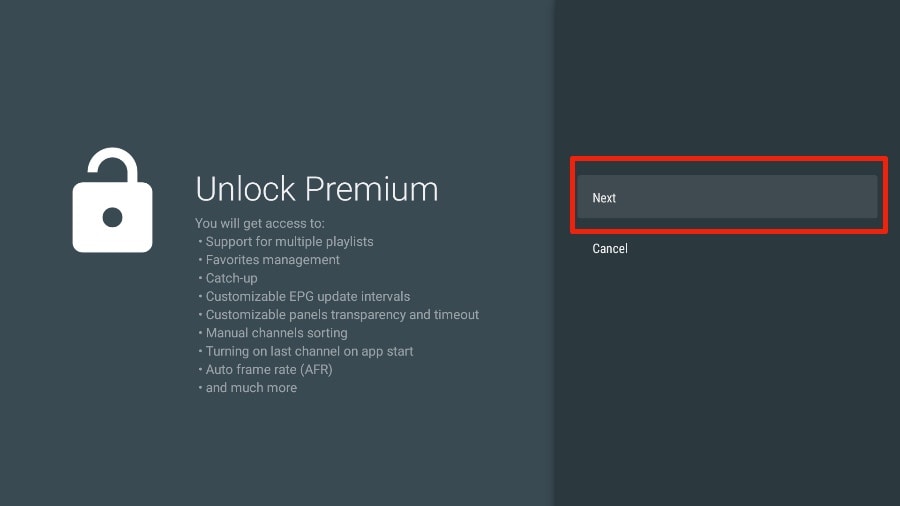 When you try to access a premium feature without a premium account, TiviMate will prompt you to upgrade to the premium version. For example, when you try to add a channel to your favorites list, TiviMate will prompt you to upgrade the application. If you wish to continue with the free version, you can click Cancel and continue using the free TiviMate application on FireStick.